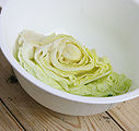 3Douse the cabbage in vinegar water, if desired. An old trick to use is to leave the cabbage lightly doused in vinegar water for a couple of minutes before proceeding to wash the cabbage with water. Usually between two or four minutes. Vinegar kills some types of bacteria and helps killing mold and mildew that could have grown on the cabbage.Ad