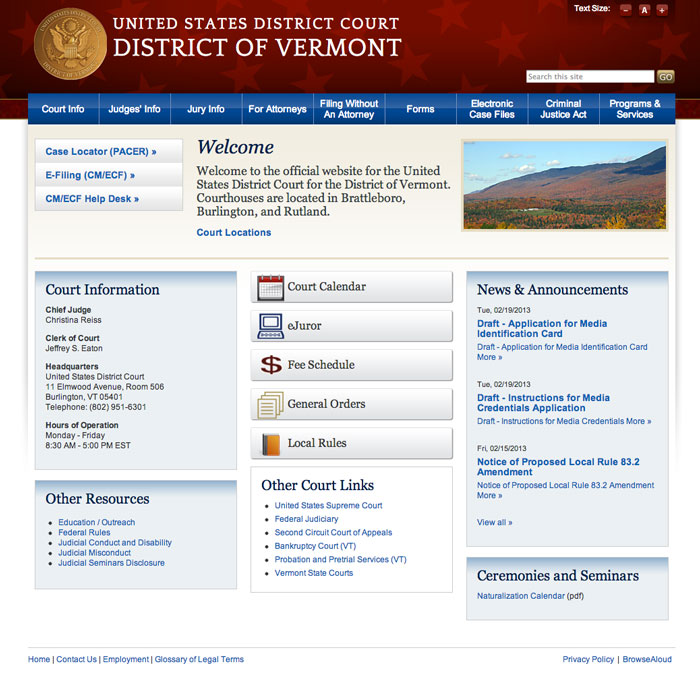 The court sites built using the toolbox are designed to offer the public consistent, user-friendly, highly functional access to court information via the Internet. The sites are customized by each court to provide the appropriate information and include content required by statute or by Judicial Conference policy. (click to enlarge)