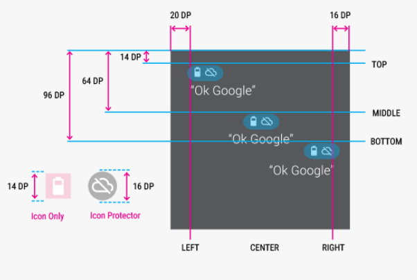 Detailed specifications and measurements for the the background canvas, notification cards, and system indicators.
