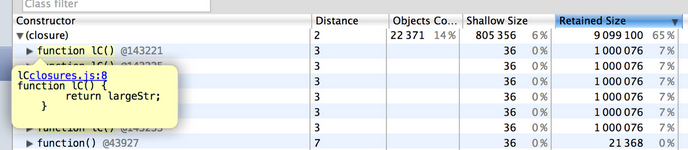 function createLargeClosure() { var largeStr = new Array(1000000).join('x'); var lC = function() { // this is NOT a named function return largeStr; }; return lC;}Whilst this example does: