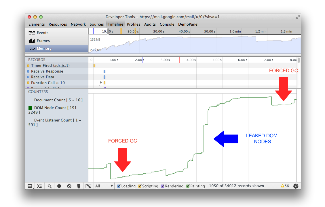 When investigating memory issues, the Timeline panel’s Memory view can be used for tracking: