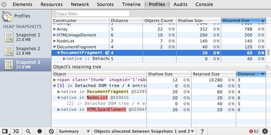 Example: Try out this example of detached nodes where you can watch node evolution in the Timeline then take heap snapshots to find detached nodes.