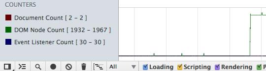 It's the rate of increase in the steepness of this curve that you need to keep an eye on.There is also a DOM node counter, Document counter and Event listener count in the Memory view which can be useful during diagnosis. DOM nodes use native memory and do not directly affect the JavaScript memory graph.