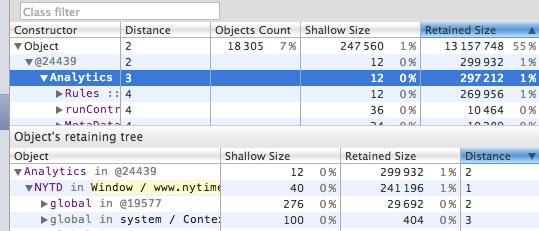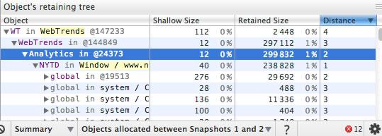 Note: In Chrome Canary, Dominators view can be enabled by going to Settings > Show advanced heap snapshot properties and restarting the DevTools.