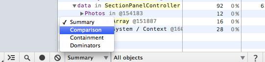 Comparison view helps you track down memory leaks, by displaying which objects have been correctly cleaned up by the garbage collector. Generally used to record and compare two (or more) memory snapshots of before and after an operation. The idea is that inspecting the delta in freed memory and reference count lets you confirm the presence and cause of a memory leak.