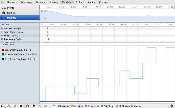 To diagnose whether memory is the issue, go to the Timeline panel and Memory view. Hit the record button and interact with your application, repeating any steps you feel may be causing a leak. Stop the recording. The graph you see will display the memory allocated to your application. If it happens to be consuming an increasing amount of this over time (without ever dropping), it’s an indication you may have a memory leak.