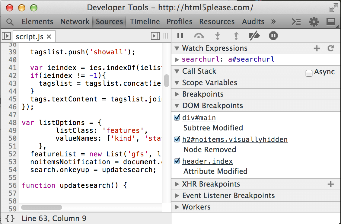 The Elements and Sources panels both include a pane for managing your DOM Breakpoints.