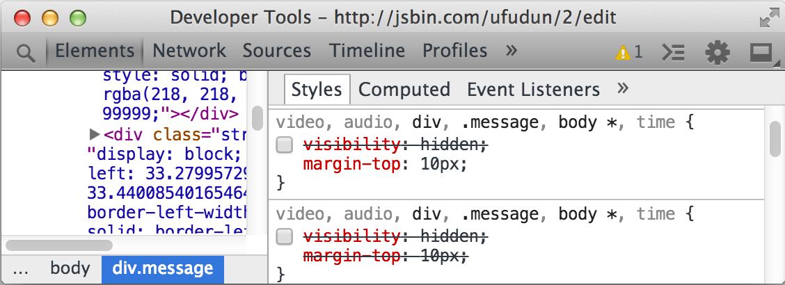 display: inline-block;overrides the user-agent defined style ofdisplay: block. - Inherited styles are displayed as a group under the "Inherited from [node]" header. Click the DOM node in the header to navigate to its position in the DOM tree view. (The CSS 2.1 properties table shows which properties are inheritable.)