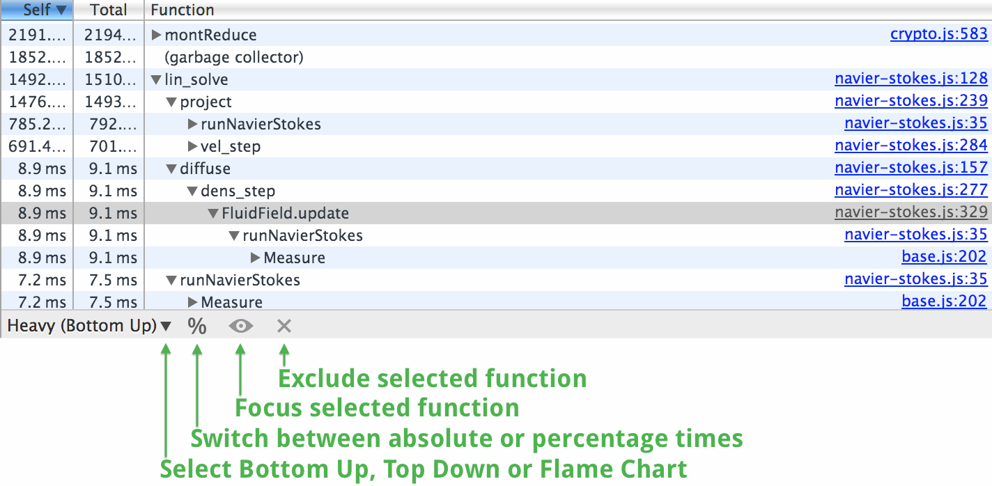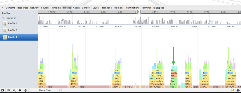 Other JavaScript profiling reports data that is aggregated over time, whereas the Flame Chart reports data by time. This means when you see events happen, you are able to drill into the time scale of them and really get some perspective on execution of JavaScript. For example, when you see big streaks of yellow in the Timeline, this is the perfect way to see the issue.