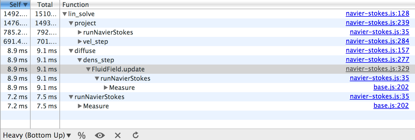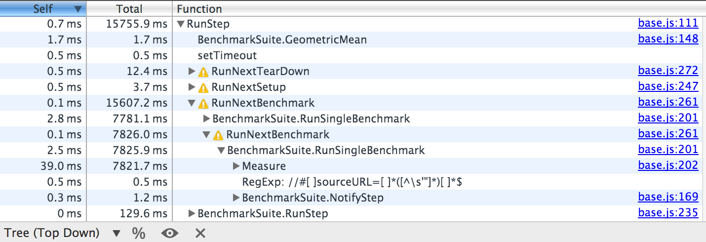 Now select the Top Down view by clicking the Bottom Up / Top Down selection button. Then click the small arrow to the left of (program) in the Function column. The Top Down view shows an overall picture of the calling structure, starting at the top of the call stack.