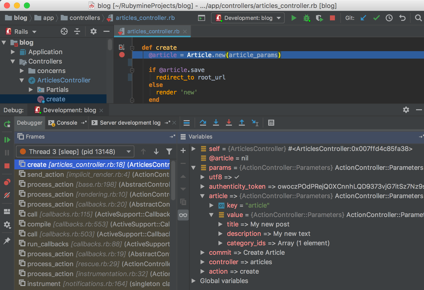 Use the powerful debugger with a graphical UI for Ruby, JavaScript, and CoffeeScript. Set breakpoints, run your code step by step and make use of all the available information at your fingertips.