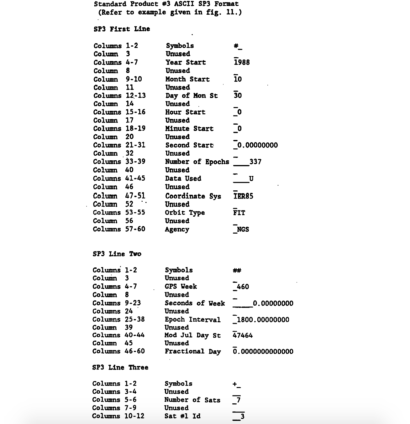 A file with .sp3 extension is a National Geodetic Survey (NGS) orbital format to store orbital information. This is an extension to NGS’s SP1 and SP2 formats, and includes the satellite clock correction information that is computed simultaneously with the orbits. It is primarily based on position and clock, and does not include velocities. The format was proposed in Remondi, 1989 and was adopted in 1991. In addition to satellite clock correction information, it includes informaiton such as orbit accuracy exponents, comment lines, the GPS week, and seconds of week associated with first epoch. SP3 files can be opened with Wolfram Research Mathematica.